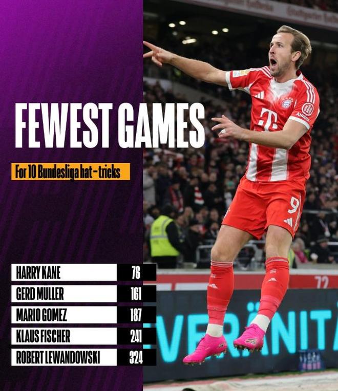 根據(jù)統(tǒng)計,凱恩在他的第76場德甲比賽中打入了在聯(lián)賽中的第10個帽子戲法,成為德甲完成10次帽子戲法所用場次最少的球員。